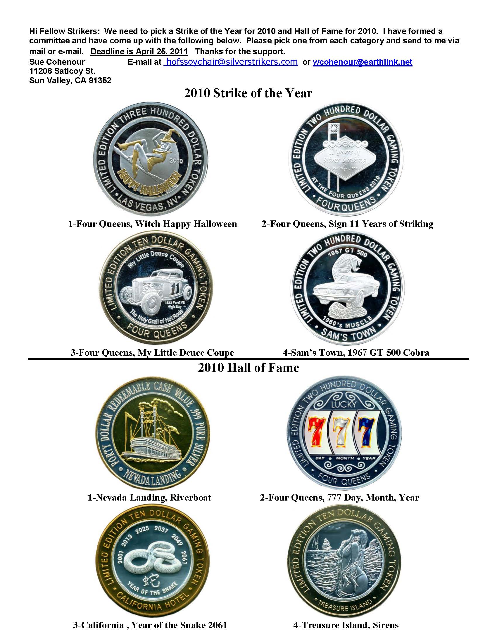 Sunshine Mint has all rights to the Silver Strike program and things are already in full gear. The first definite yes was from Rick Ronca at the El Cortez. As the El Cortez starts celebrating their 70th anniversary in May they plan on having two silver strike machines with four new house strikes and a red cap by June for CC>CC convention. I know there are many collectors who love the anniversary strikes and knowing Rick I am sure he will surprise us with some good looking strikes. Sunshine has been talking with the Mirage and Circus Circus and this is just the beginning. Convention is going to be great this year so everyone needs to start making plans for this June to be in Vegas. The Four Queens is having their Silver Strike Tournament on Monday and Tuesday June 20, 21, 2011, with convention starting Thursday and our club party Friday night.