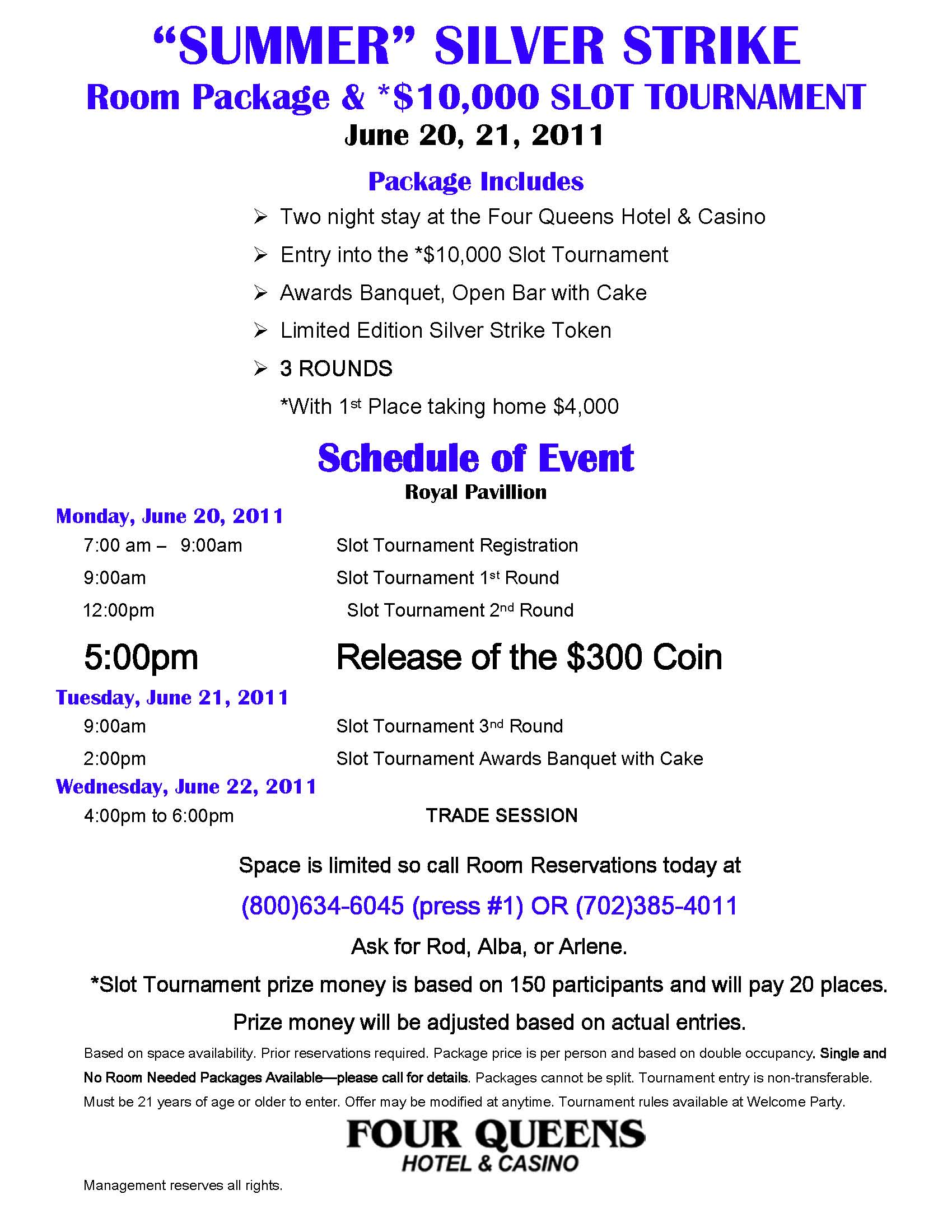 Remember, the Four Queens Silver Strike Tournament is scheduled for June 20-21, 2011; and the CC>CC Convention is June 22-25, 2011. Looks like we will have a great time at tournament and convention with more casinos to get Silver Strikes from and lots of people to see.