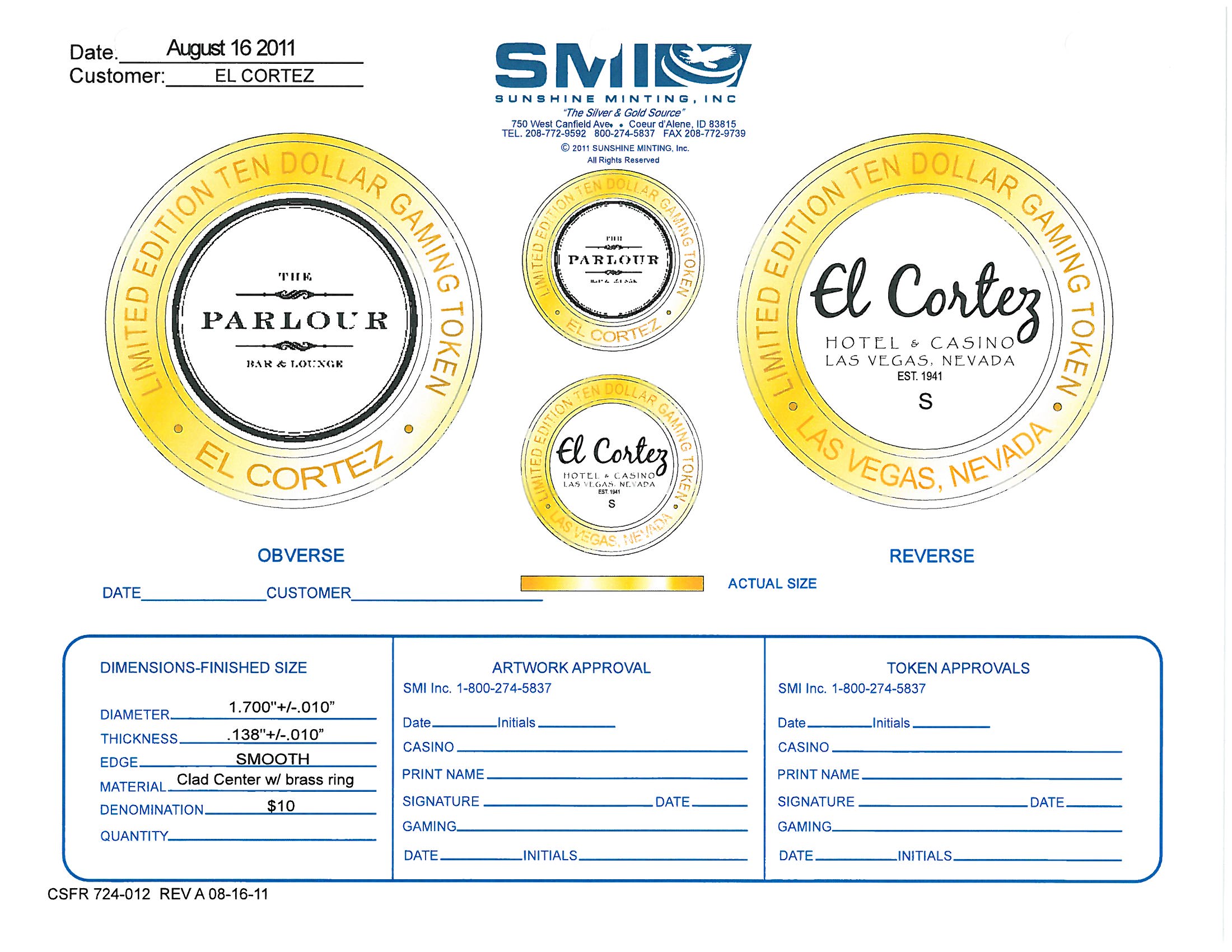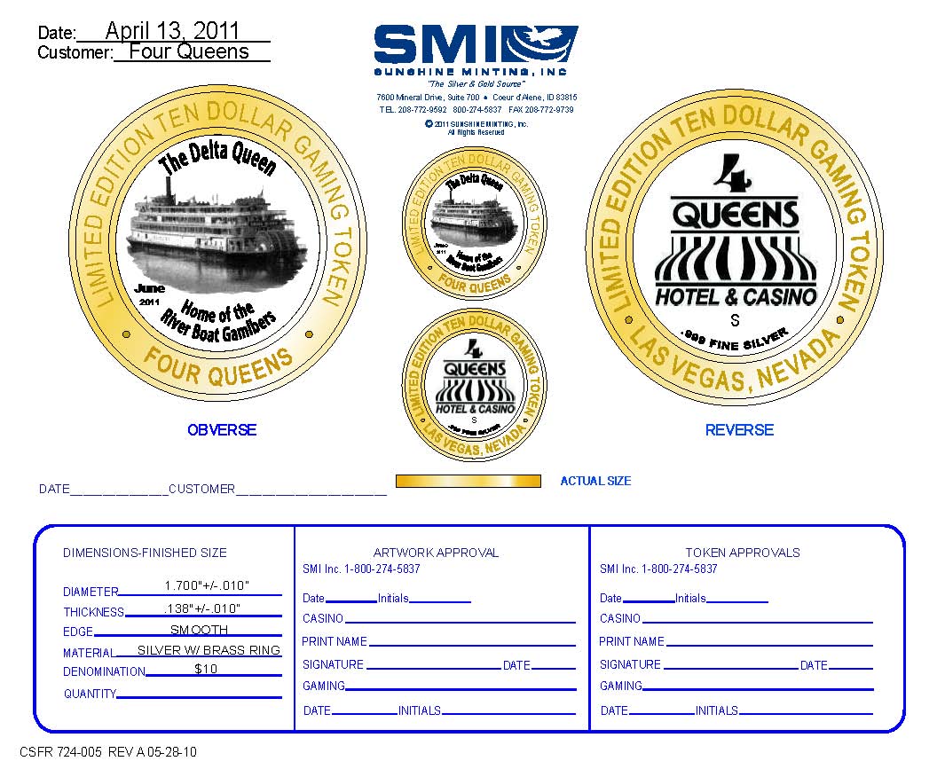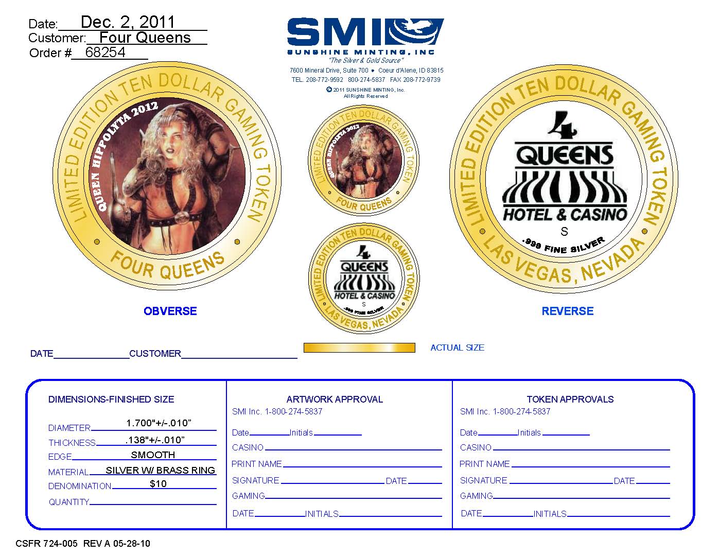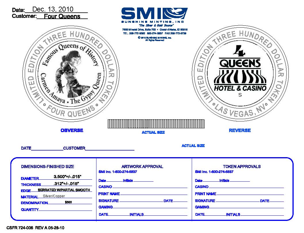 Four Queens Carmen Amaya $300 Strike - Shaun Webster had the prototype delivered on 2-14-11, and the gaming prototype was delivered 2-15-11. They are in the process of minting the strikes, and then they will be sent for the gold plating. It looks like we can expect them to be back in Vegas sometime during the first two weeks of March. They should be able to give us a fairly accurate delivery date by the first of March.