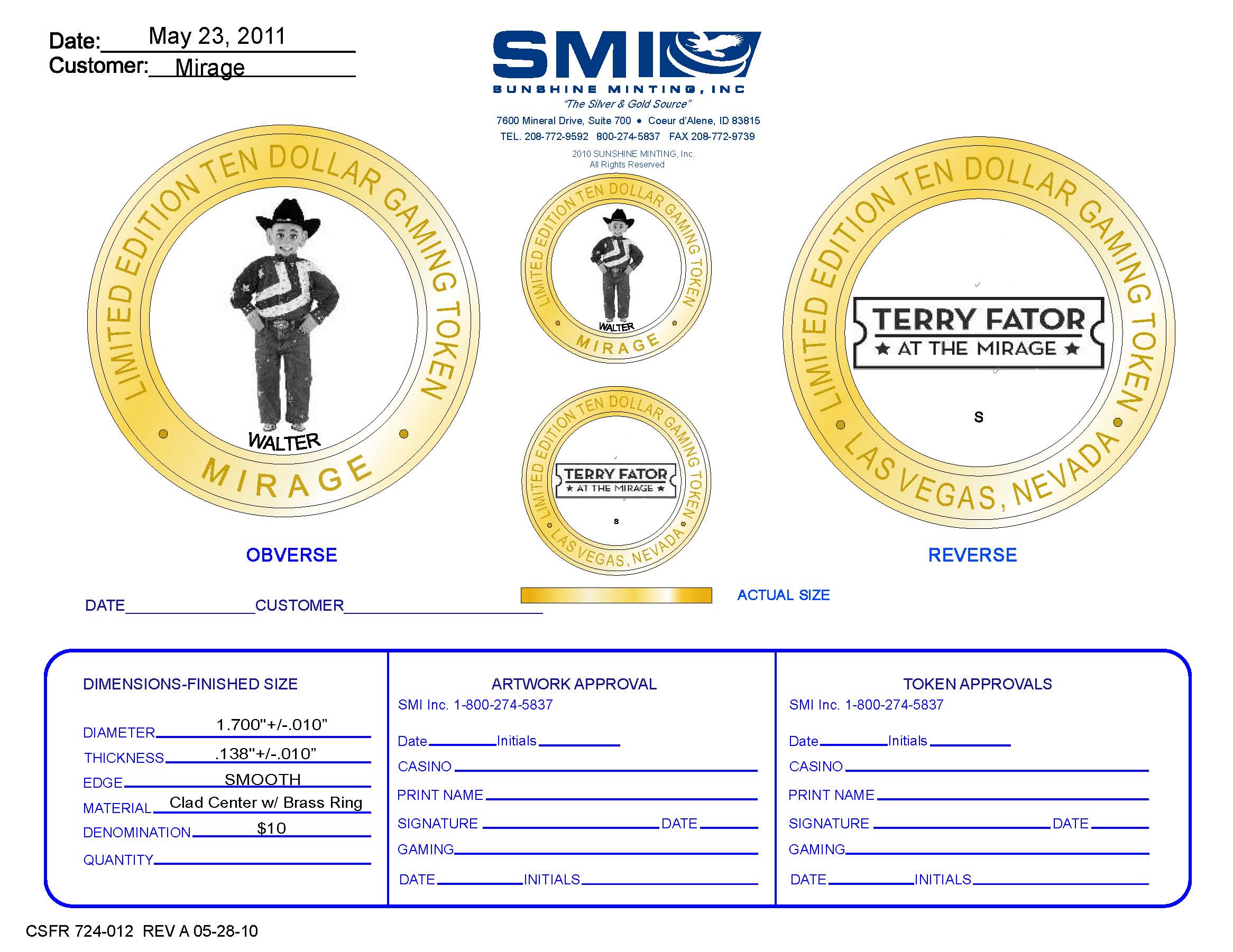 Not only is Sunshine busy minting strikes, they are working on artwork; and lots of it. El Cortez is working on artwork for their new house strikes, as well as a red cap. The Mirage is looking at some artwork using Terry Fator. That's a great idea. He has lots of characters that should look real cute in clad or silver. The Mirage is also considering red caps. Circus Circus has Silver Strike machines, but we are still waiting to hear if they are looking at artwork.