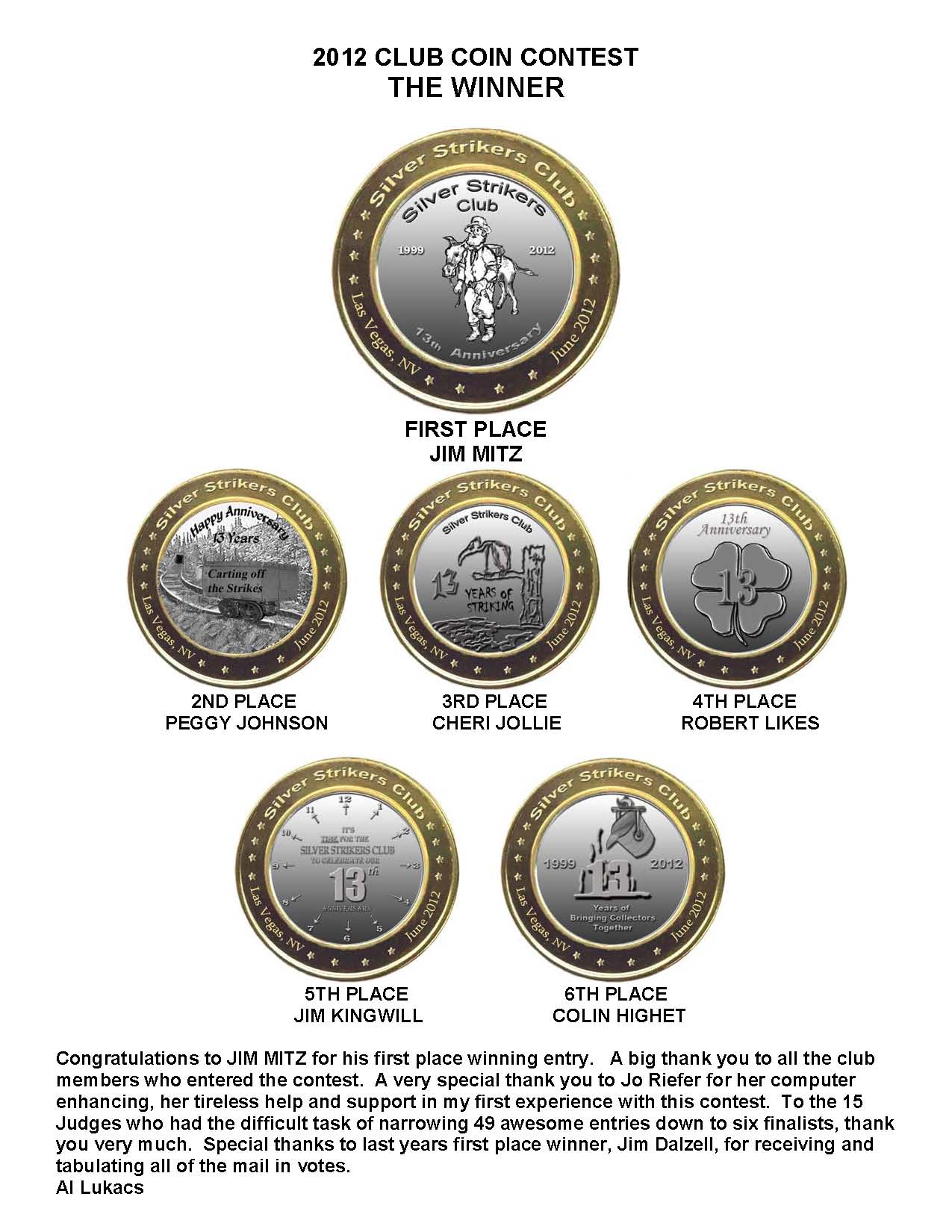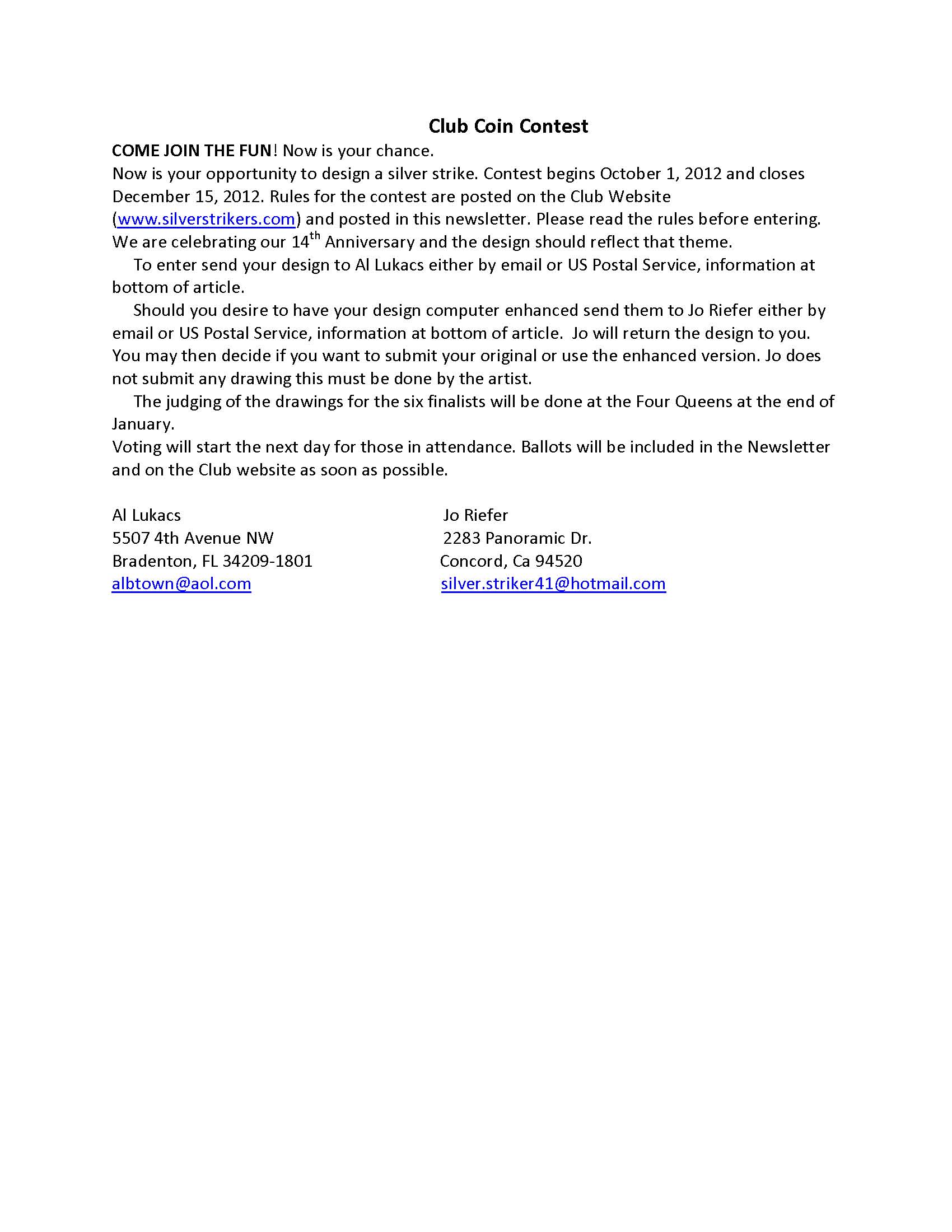 In other news, the BOD authorized the Club Coin Committee to purchase silver for the 2013 Club Coin. Because of the foresight of the Board, we able to purchase silver for next year's coin at a relatively low $26.98 an ounce. Silver is currently over $33.50 an ounce. I want to commend the Board and Committee Members because this advanced purchase has resulted in a substantial savings in silver for next year's coin.