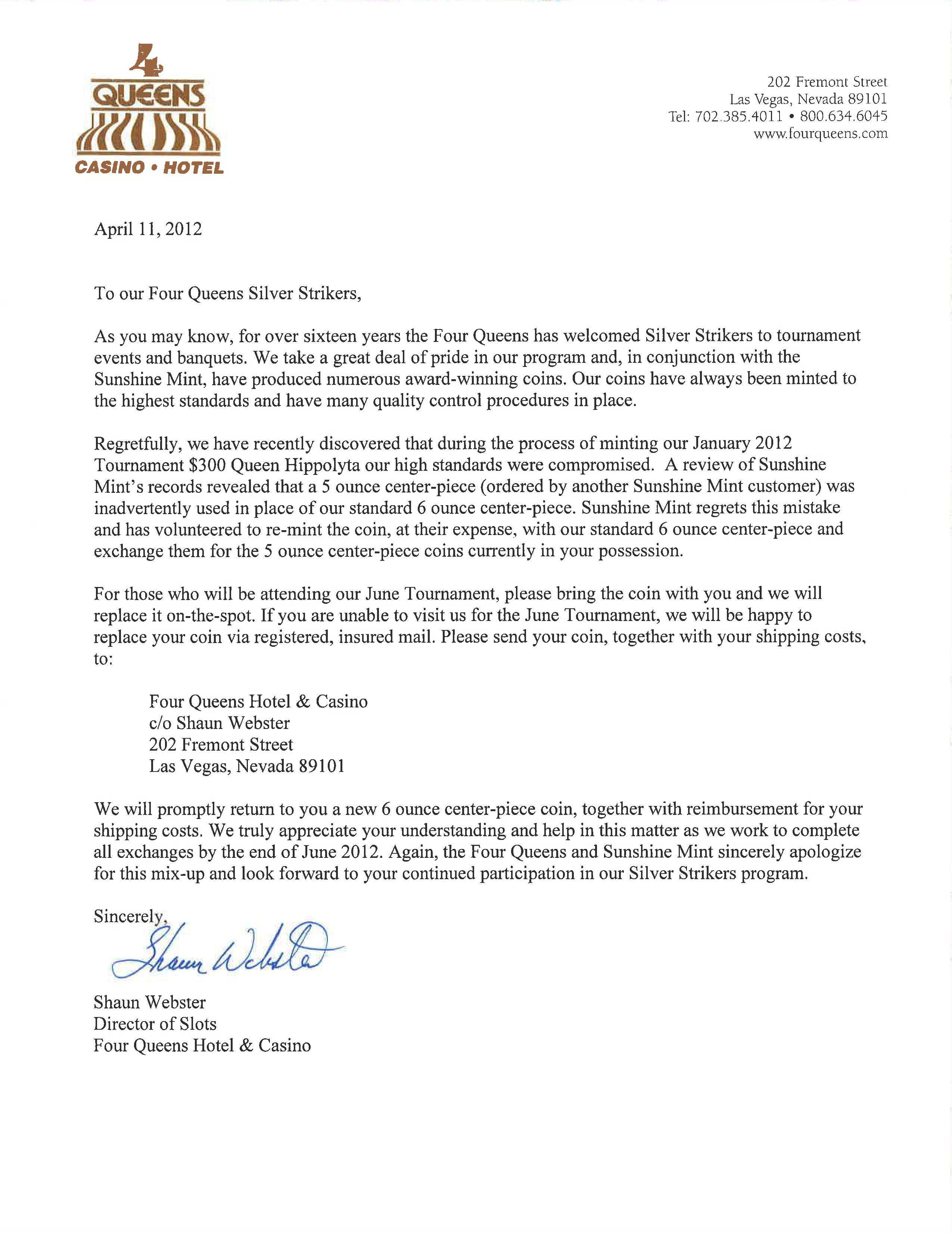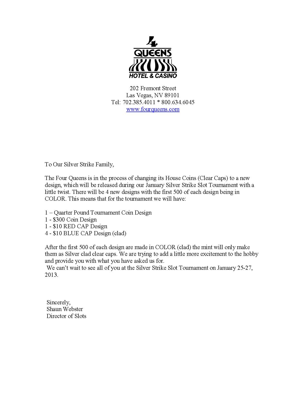 Silver Strike Note from the Four Queens - Four Queens Silver Strike Note PDF Document Version, Four Queens Silver Strike Note JPEG Version