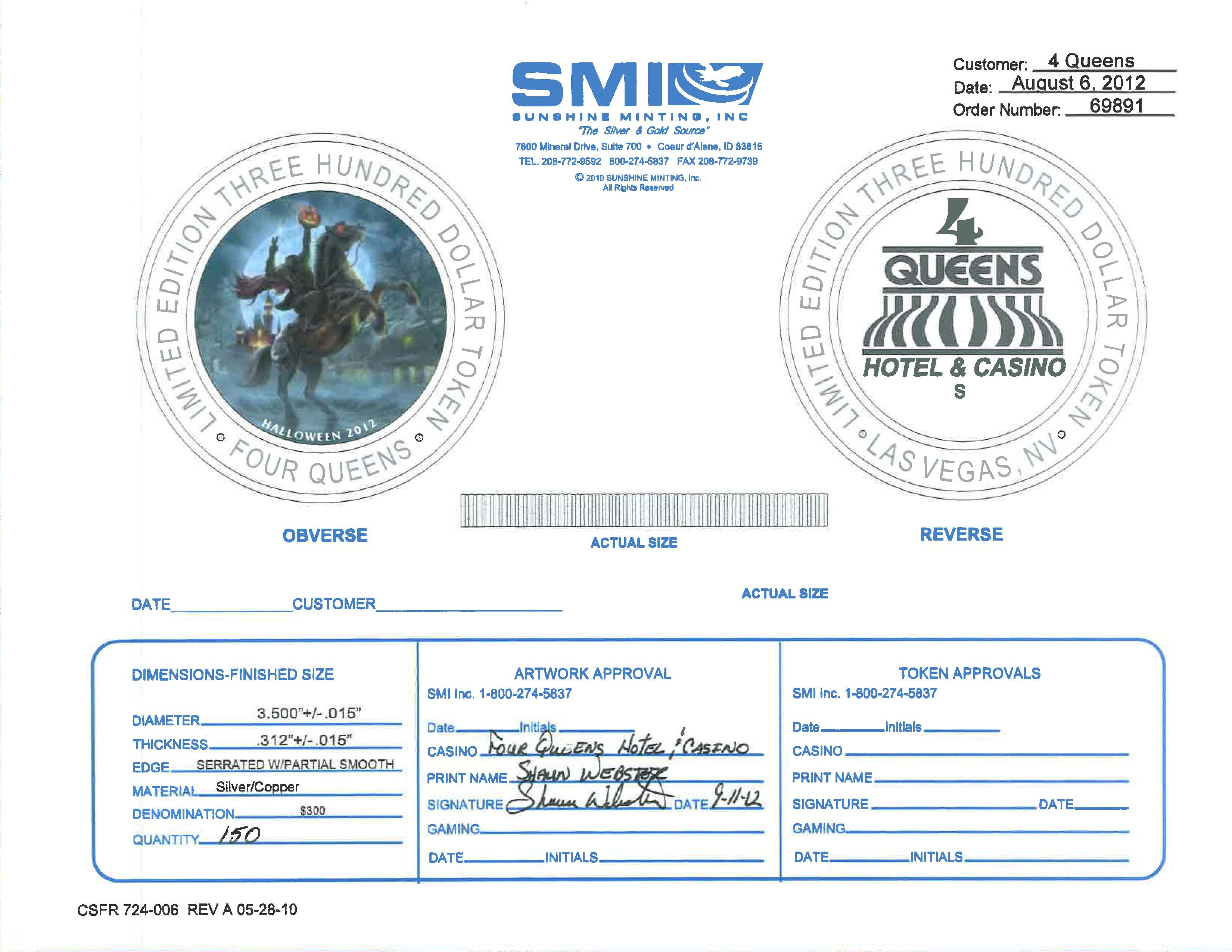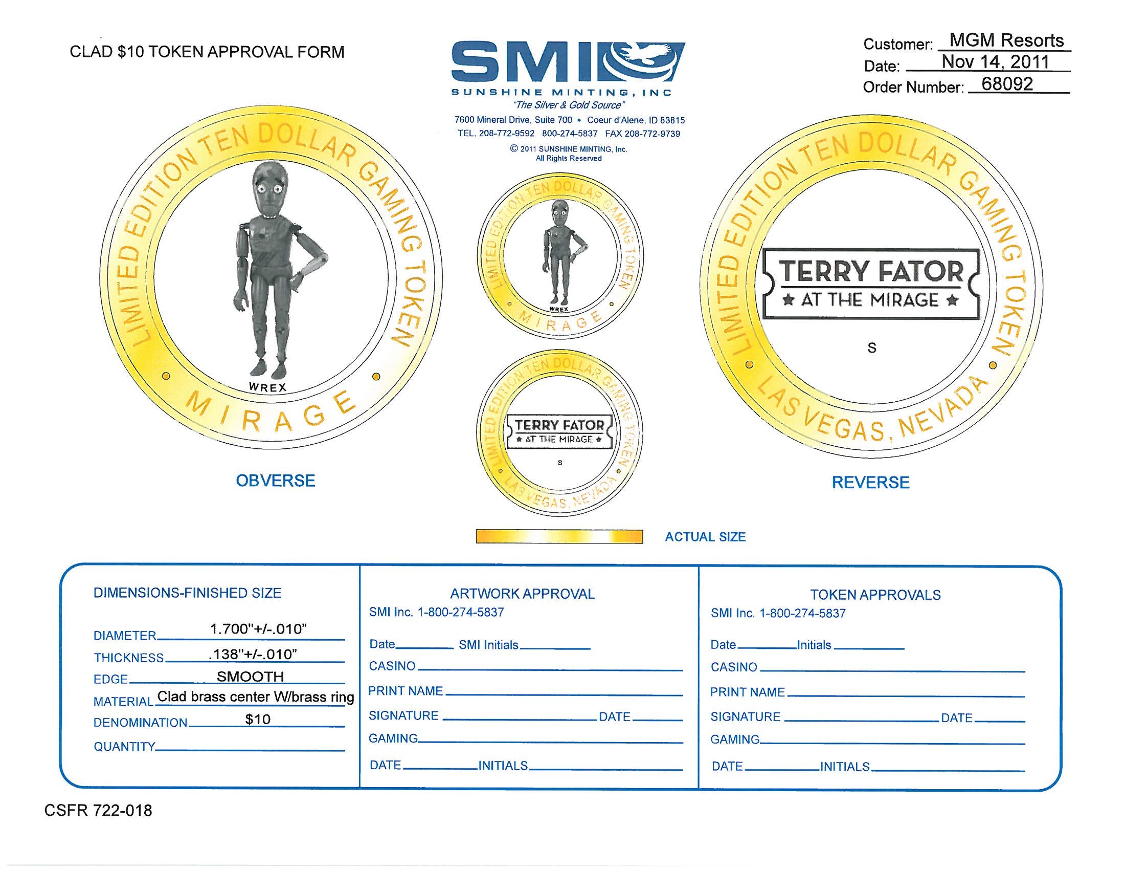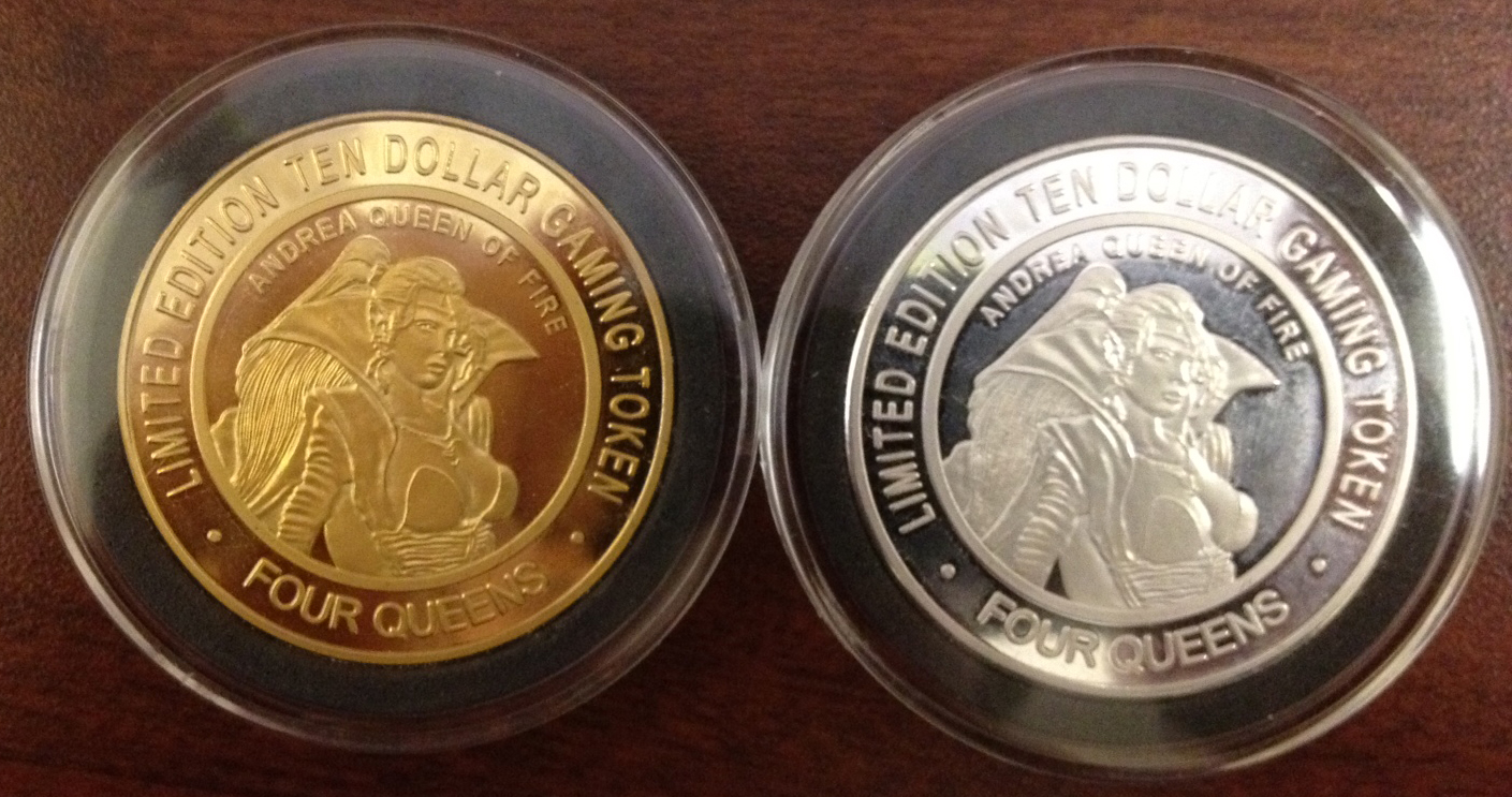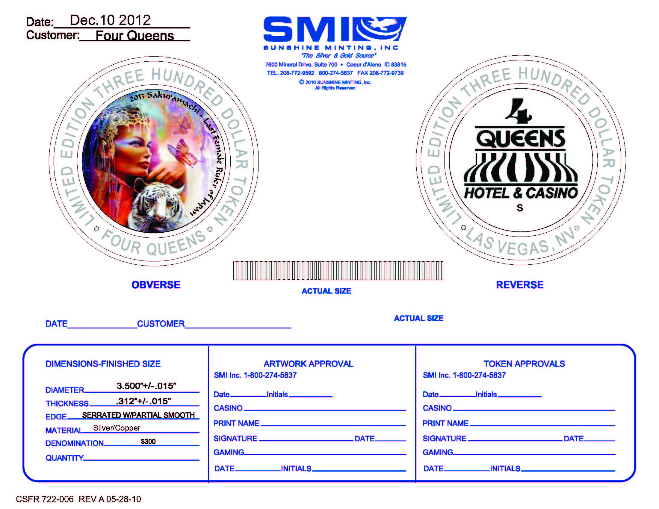 Per Shaun Webster's previous Current News item (02-28-2012), it has been determined that the strikes in question are counterfeit. They have no monetary value. Please do not try to turn them in to a casino. The tokens are one piece and the base is made of brass and plated thinly with either silver or gold plating. They are approximately 36 grams in weight, not the 40 grams of a silver strike. So far, we are aware of counterfeit tokens from the Four Queens, Sam‘s Town and Planet Hollywood.