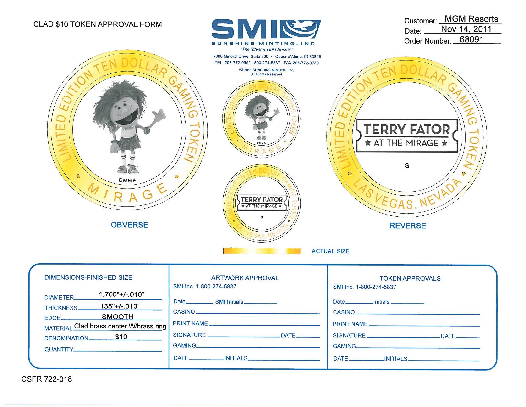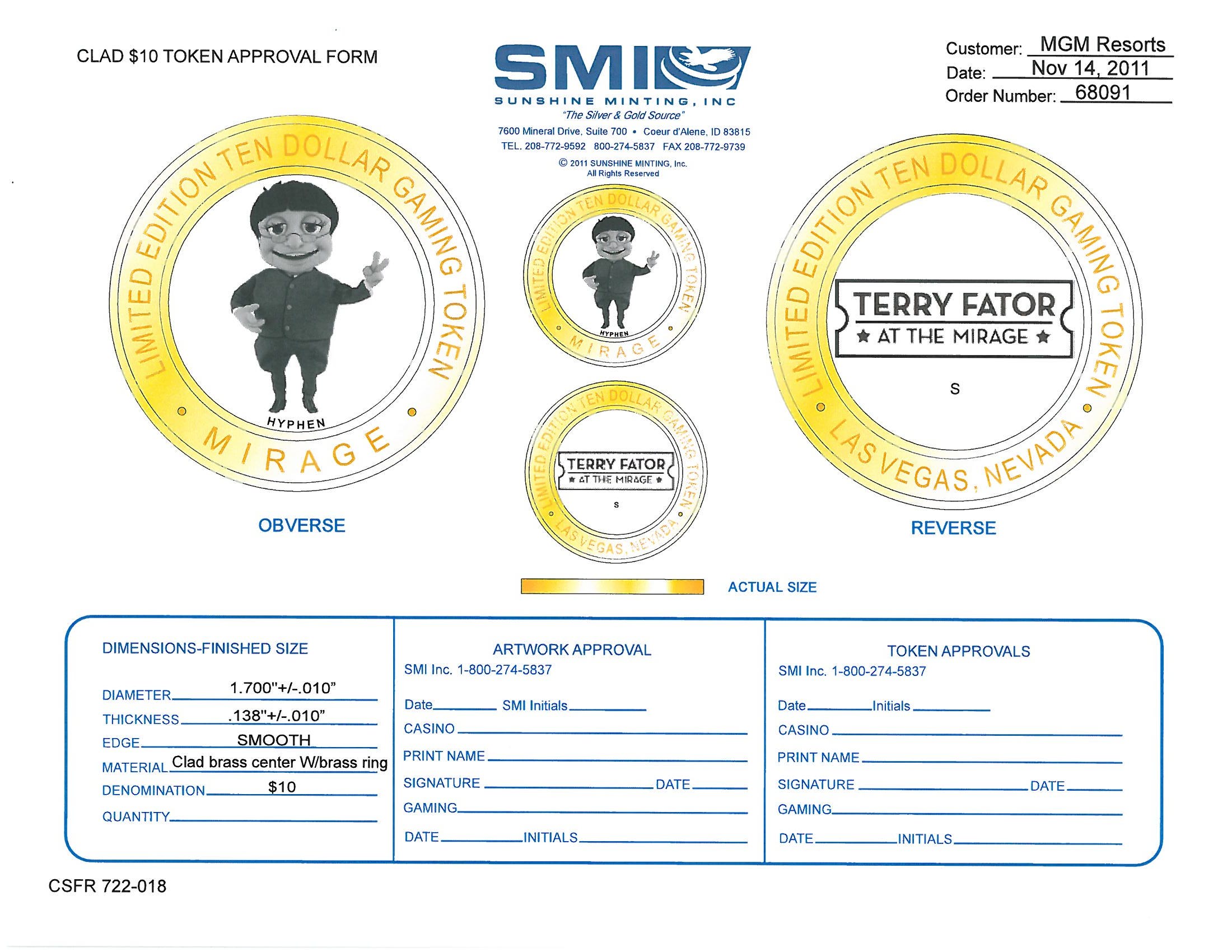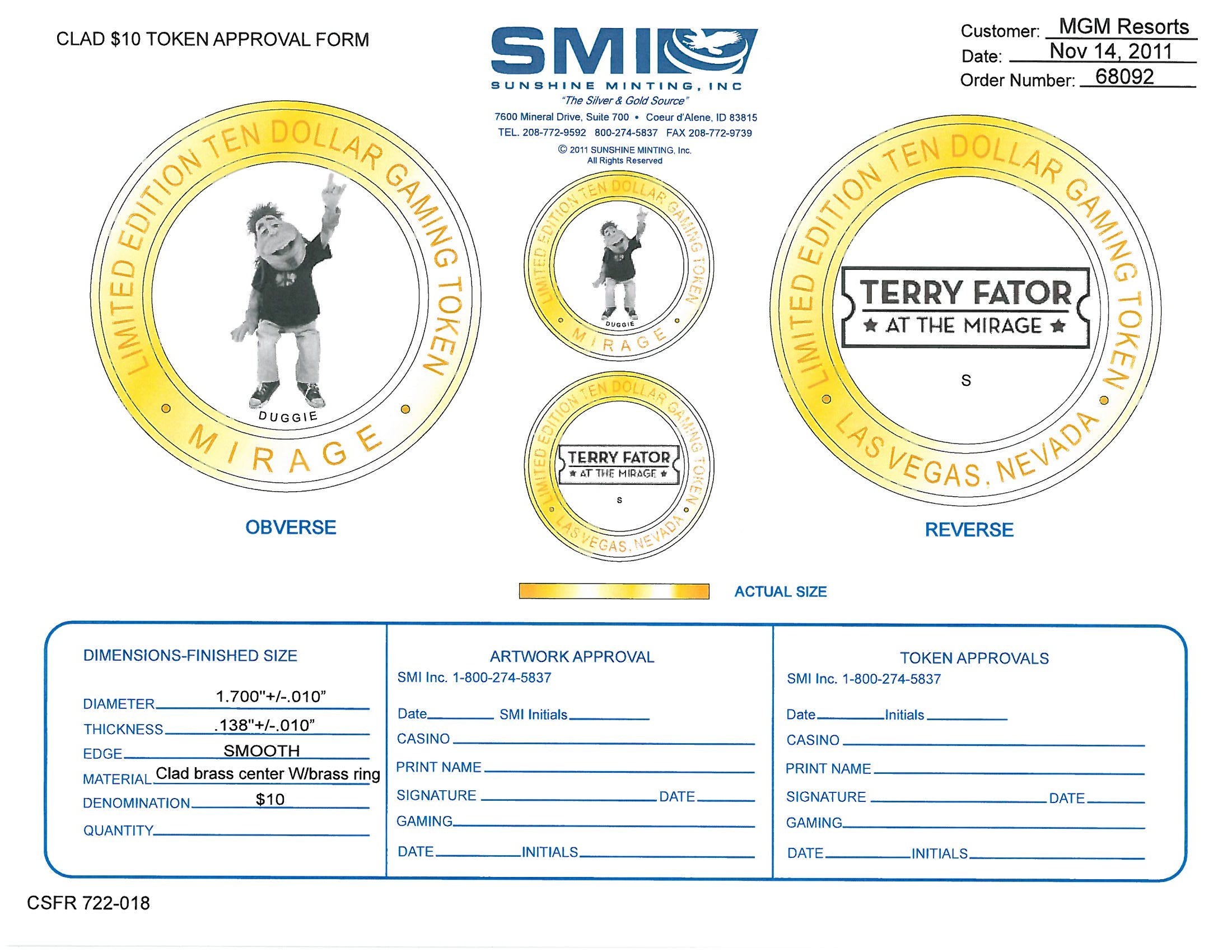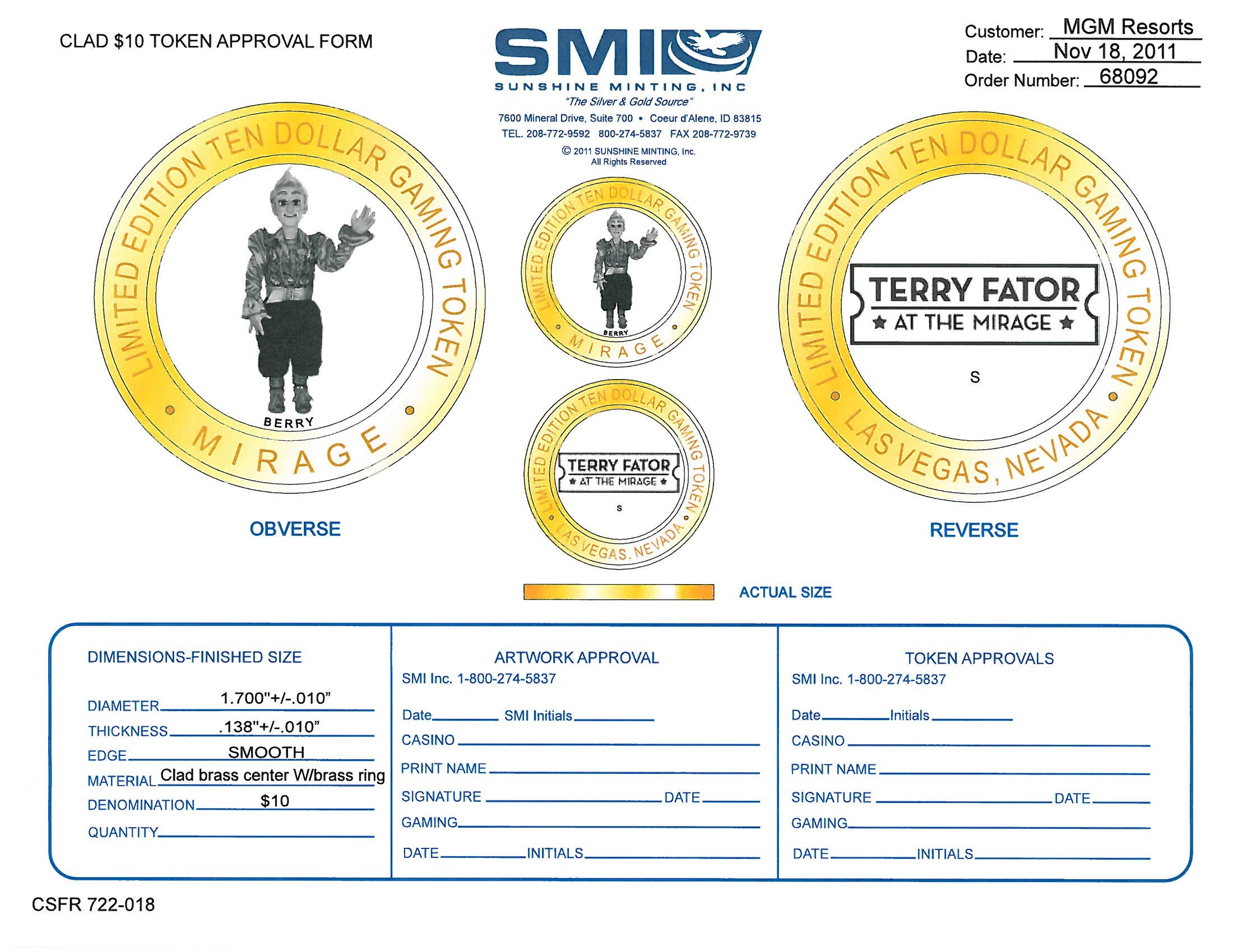 Per Shaun Webster's previous Current News item (02-28-2012), it has been determined that the strikes in question are counterfeit. They have no monetary value. Please do not try to turn them in to a casino. The tokens are one piece and the base is made of brass and plated thinly with either silver or gold plating. They are approximately 36 grams in weight, not the 40 grams of a silver strike. So far, we are aware of counterfeit tokens from the Four Queens, Sam‘s Town and Planet Hollywood.