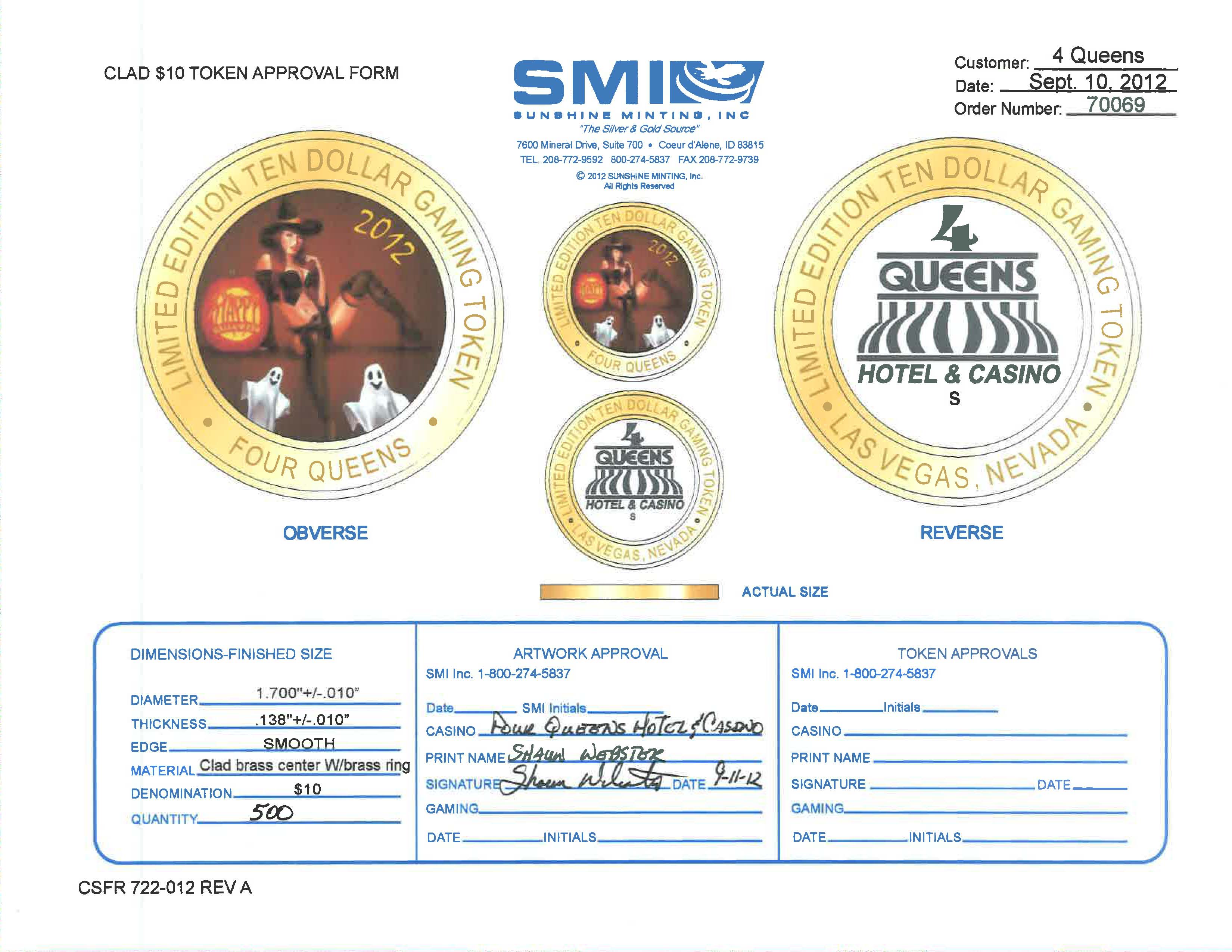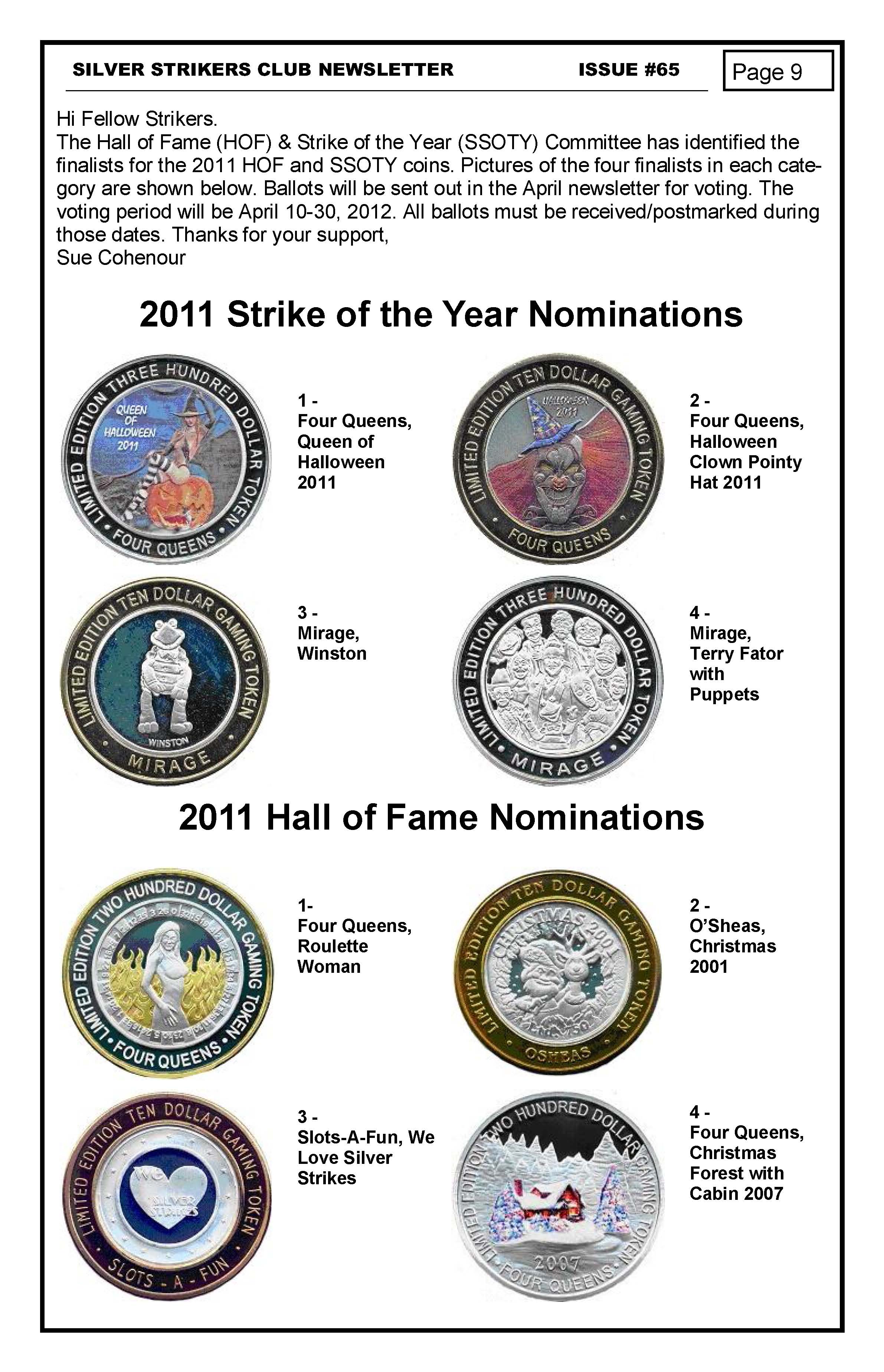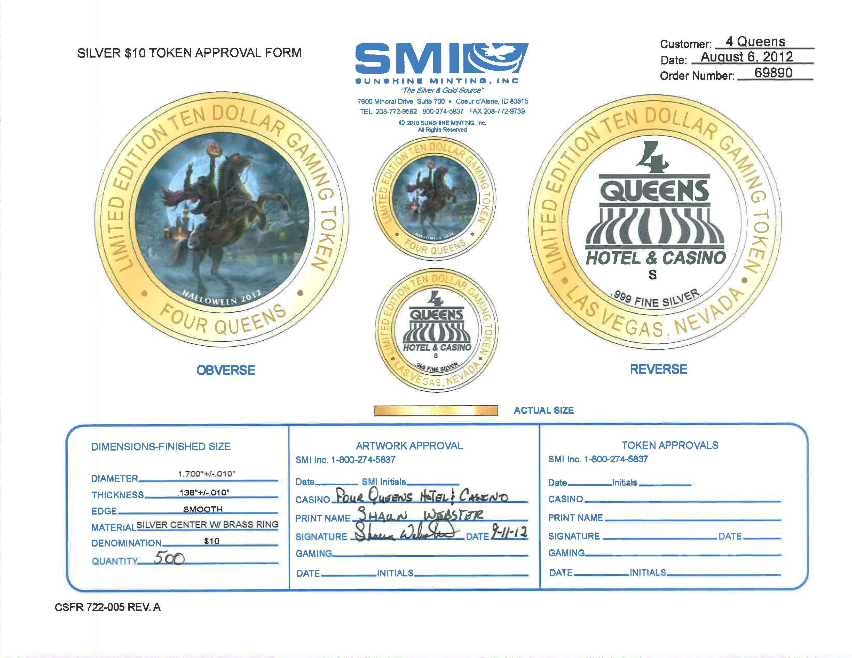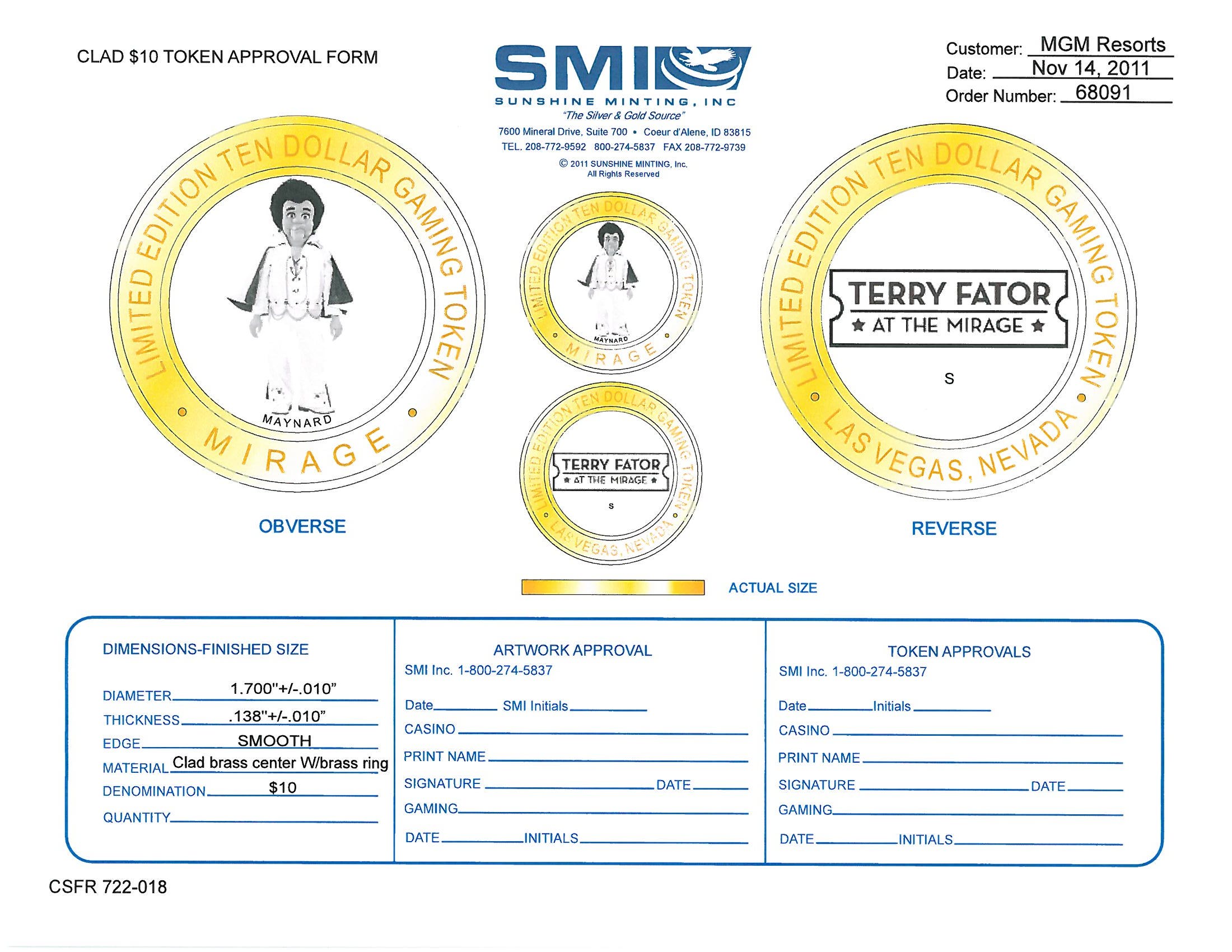 Per Shaun Webster's previous Current News item (02-28-2012), it has been determined that the strikes in question are counterfeit. They have no monetary value. Please do not try to turn them in to a casino. The tokens are one piece and the base is made of brass and plated thinly with either silver or gold plating. They are approximately 36 grams in weight, not the 40 grams of a silver strike. So far, we are aware of counterfeit tokens from the Four Queens, Sam‘s Town and Planet Hollywood.