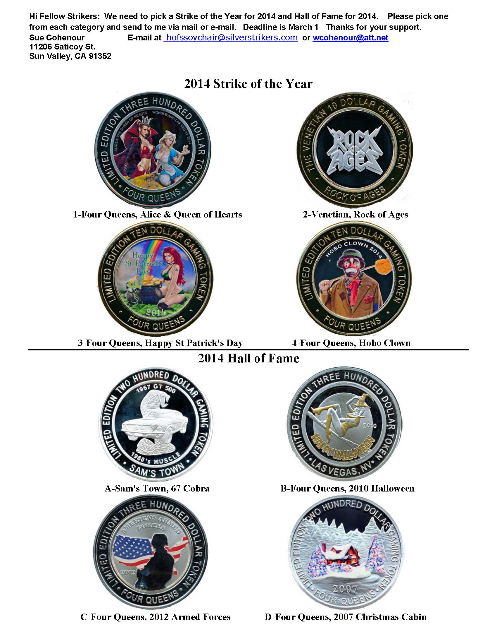 You have three ways to submit your vote for the Club Coin, by mail, email or on-line.